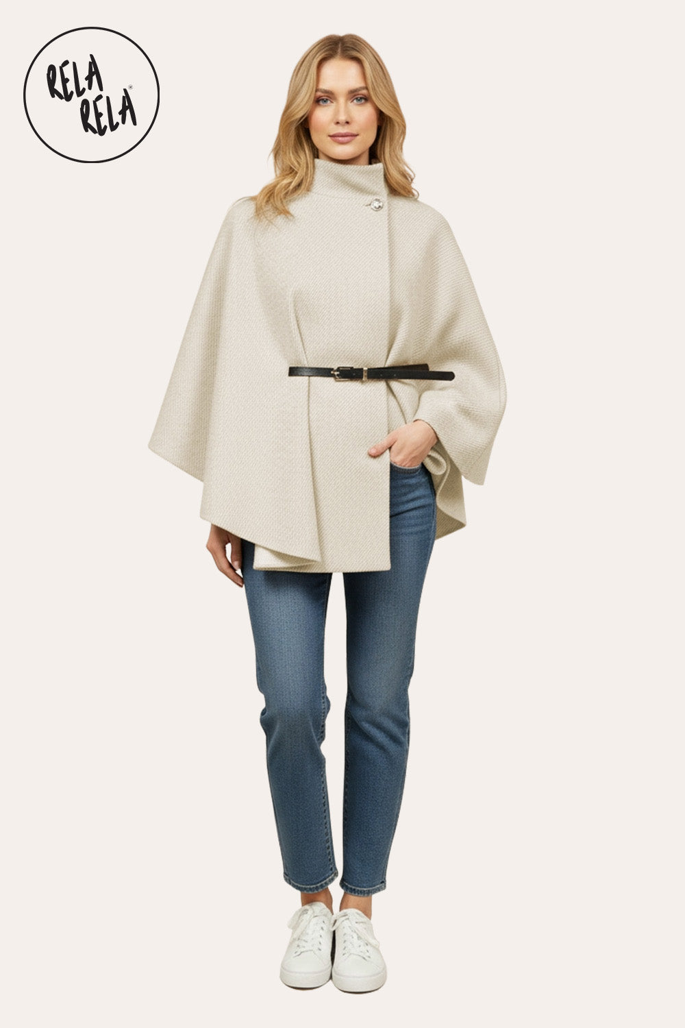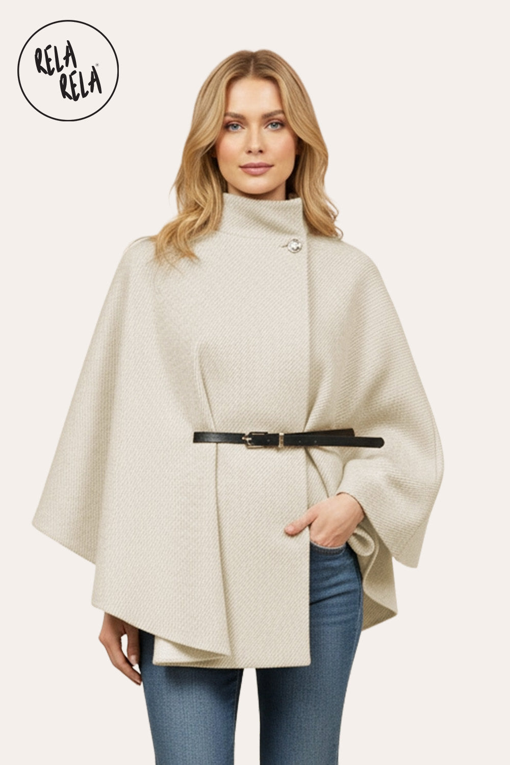Elevate your autumn and winter wardrobe with this beige belted poncho cape jacket. Featuring a high-neck design and button closure, it offers both style and warmth. The relaxed silhouette makes it easy to layer over tops, while the belted waist adds shape and elegance for a polished finish.