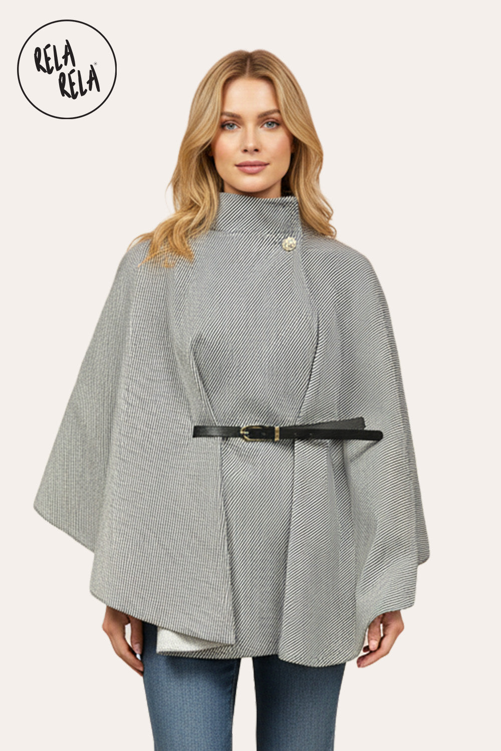 Elegant Belted High Neck Poncho Cape Jacket in Charcoal