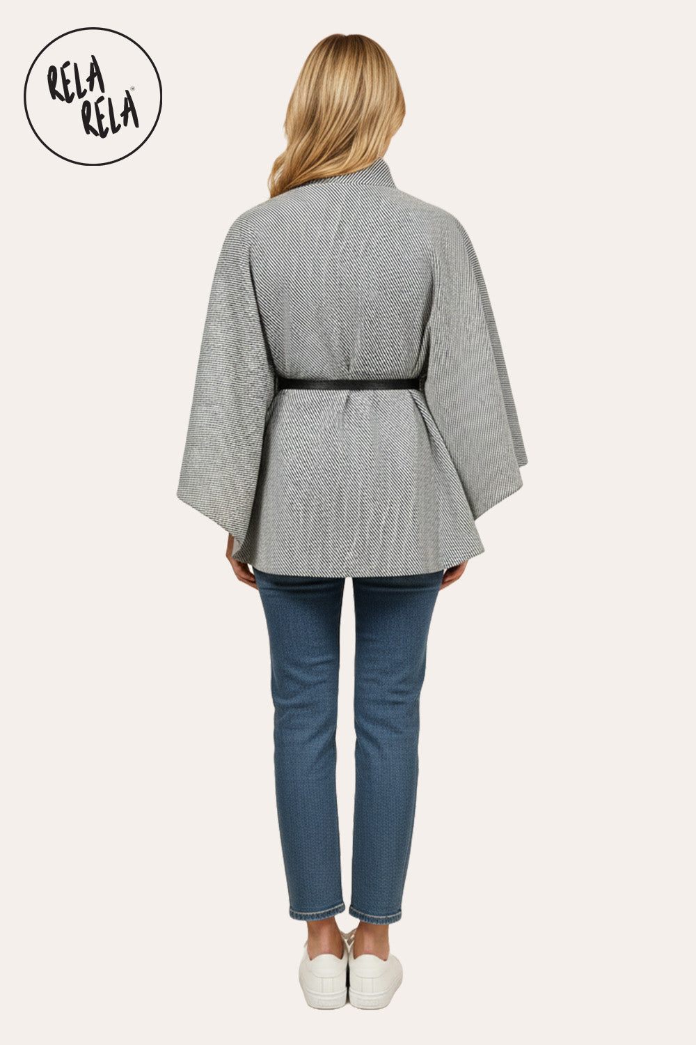 Featuring a waist-defining belt, this jacket offers a flattering fit while maintaining the flowy elegance of a poncho silhouette. The charcoal hue gives it a modern, versatile edge—easy to style with jeans, tailored trousers, or knit dresses for any occasion.