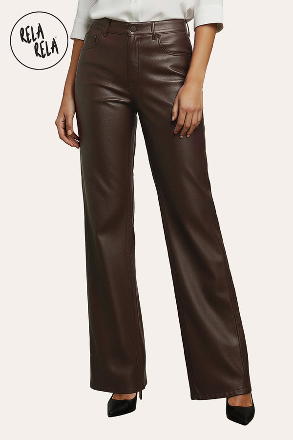 Faux Leather High Waist Dad Fit Wide Leg Trousers in Chocolate