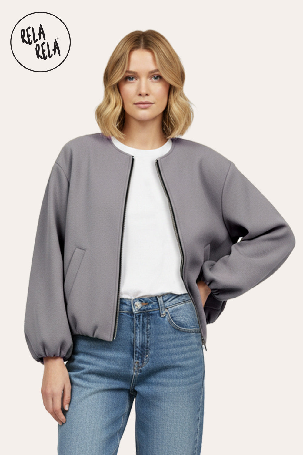 Elevate your everyday outfits with this grey zip-up bomber jacket, a stylish and versatile addition to your wardrobe.