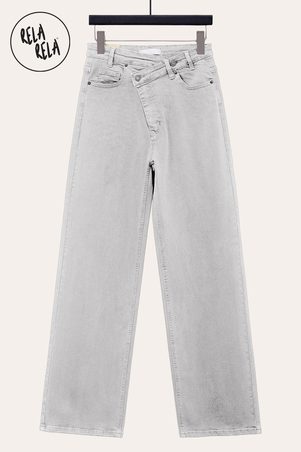 Elevate your streetwear with these stretchy asymmetric waist wide leg jeans, combining modern cross-front design, flattering structure, and all-day comfort in a distinctive acid wash denim finish.