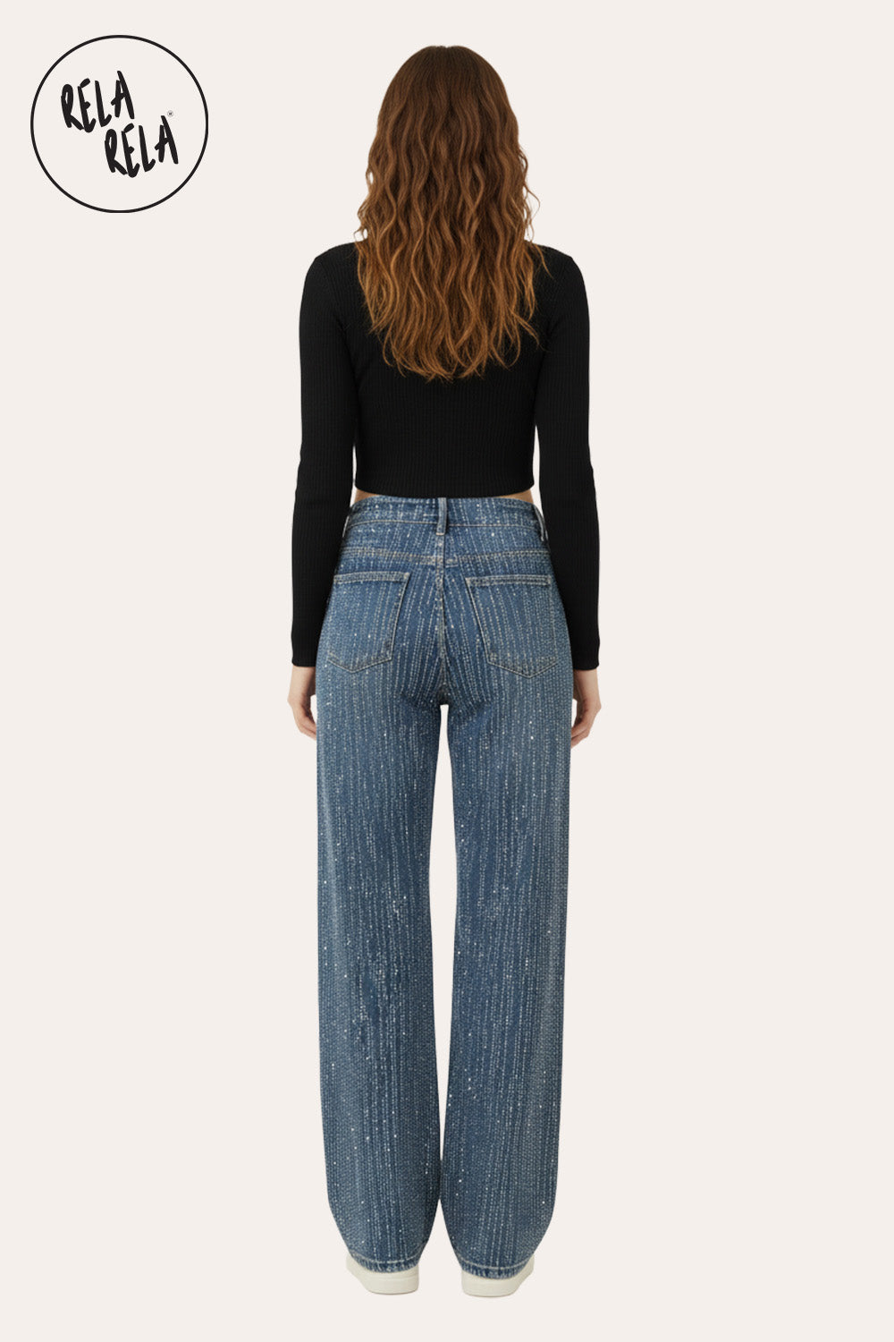 Upgrade your wardrobe with our Denim Blue Rhinestone Dad Fit Stretchy Jeans, a chic combination of comfort, effortless style, and subtle sparkle. Featuring shimmering rhinestones across the fabric, these jeans create a polished, eye-catching look without being overly bold.