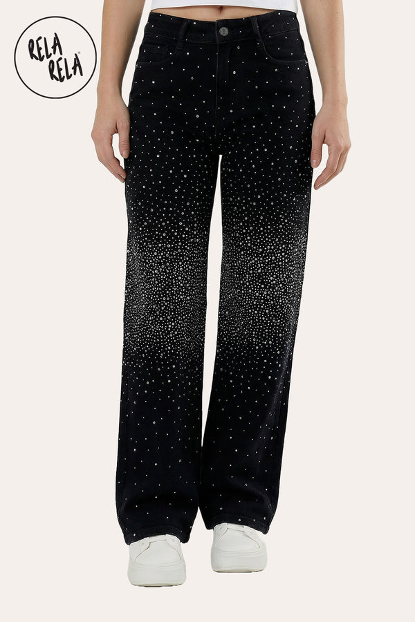 Women’s Black Sparkle Jeans – Stretch Wide Leg Denim with Rhinestones