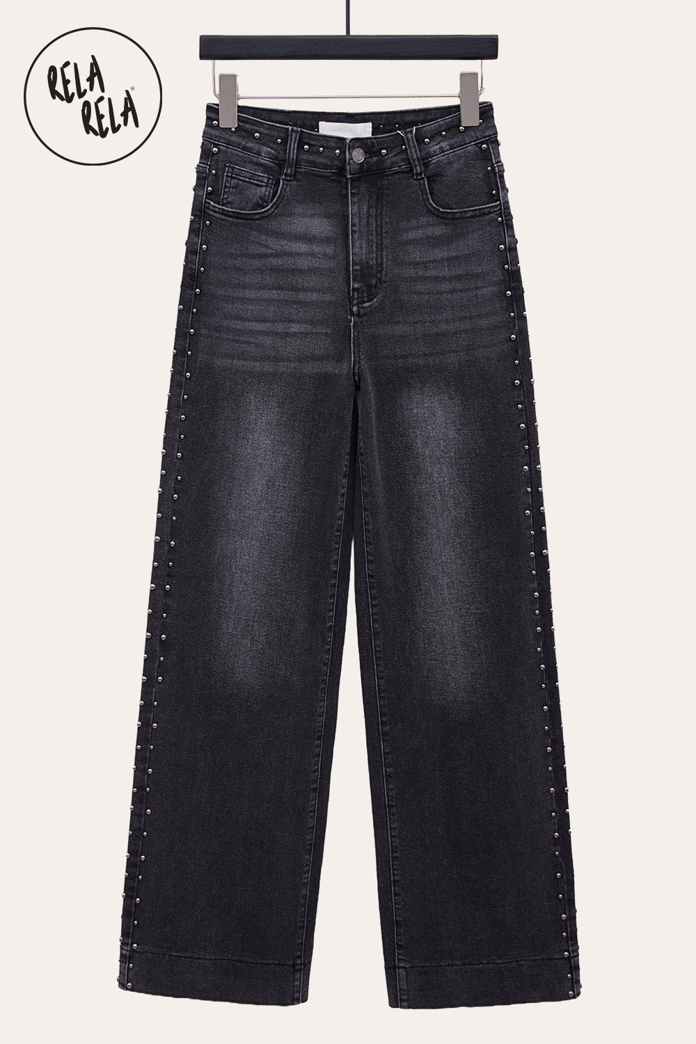 Stretchy Studded Rivet Wide Leg Jeans in Charcoal