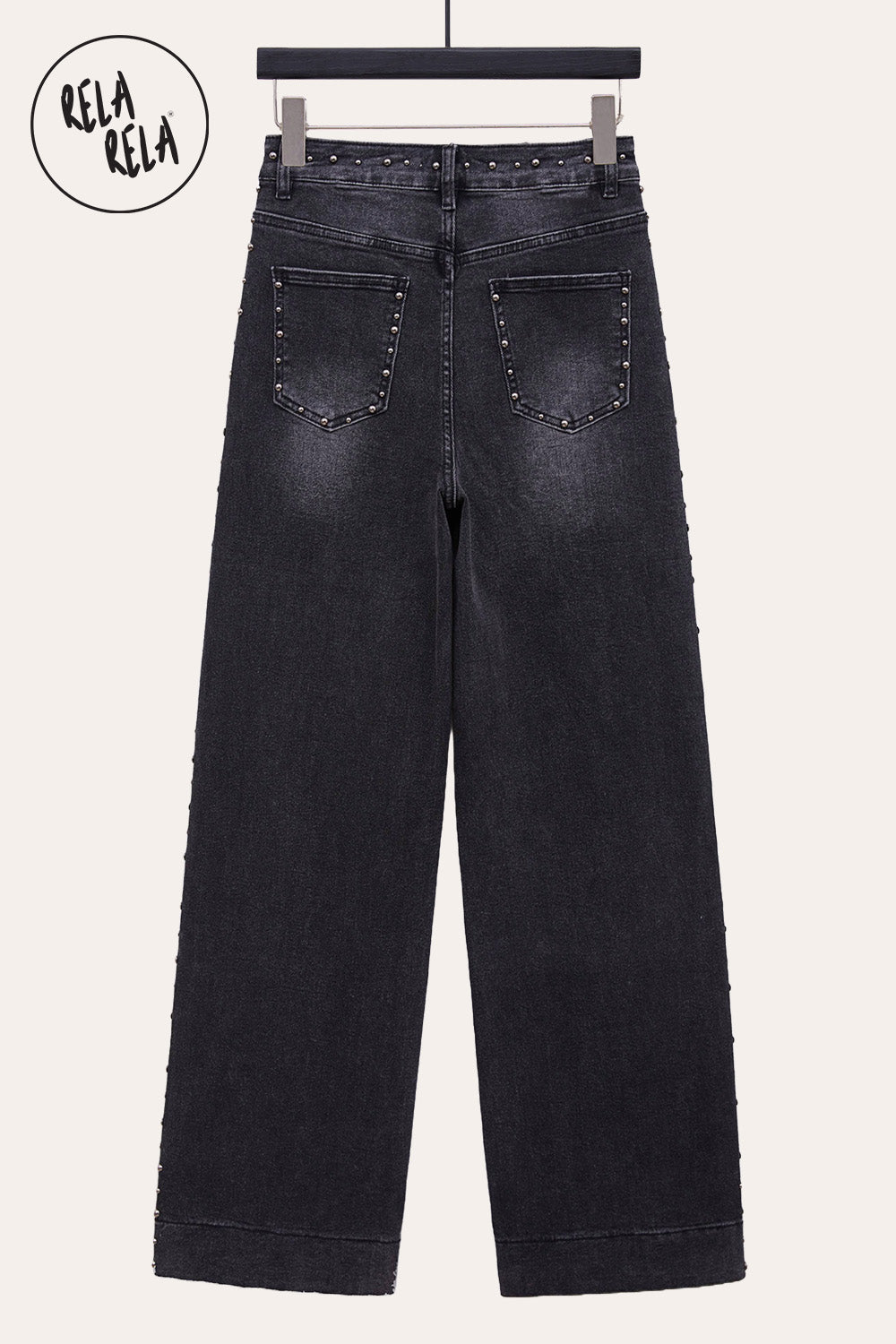 Update your denim wardrobe with these Stretchy Studded Rivet Wide Leg Jeans in a sleek Charcoal tone. Designed with a relaxed dad fit and flattering mid-waist, these jeans deliver effortless comfort and a modern silhouette, perfect for everyday casual wear.
