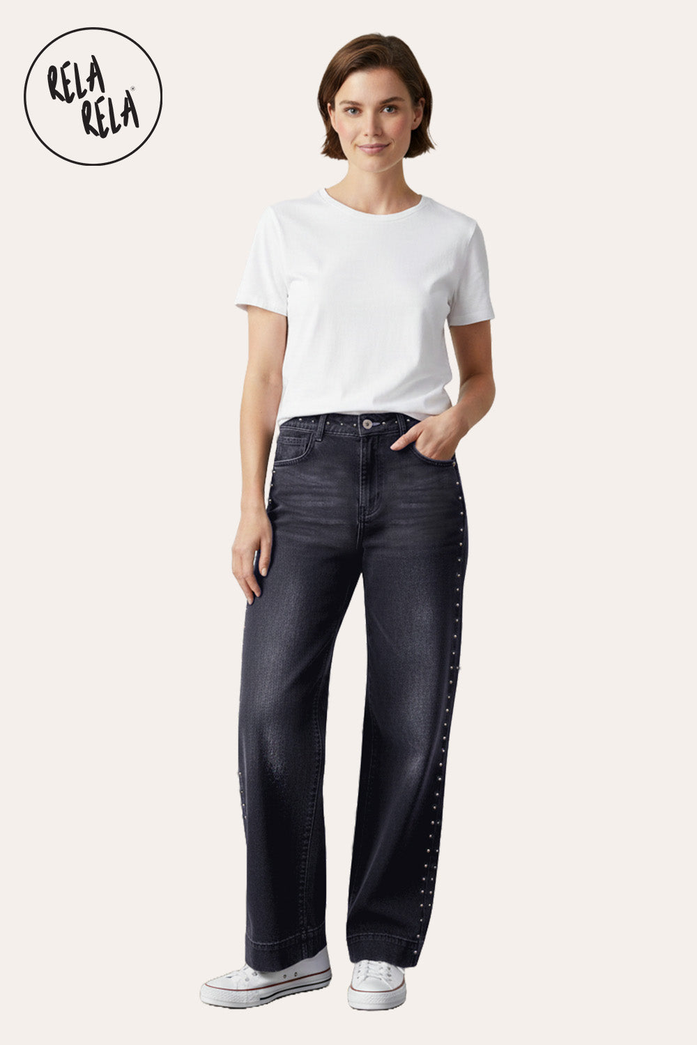 Crafted from stretchy fabric, they move with you throughout the day, while the metallic studded rivet accents add a subtle edge. The wide leg design ensures a laid-back, trendy look, easily styled with fitted tops, cropped jackets, or oversized sweaters.