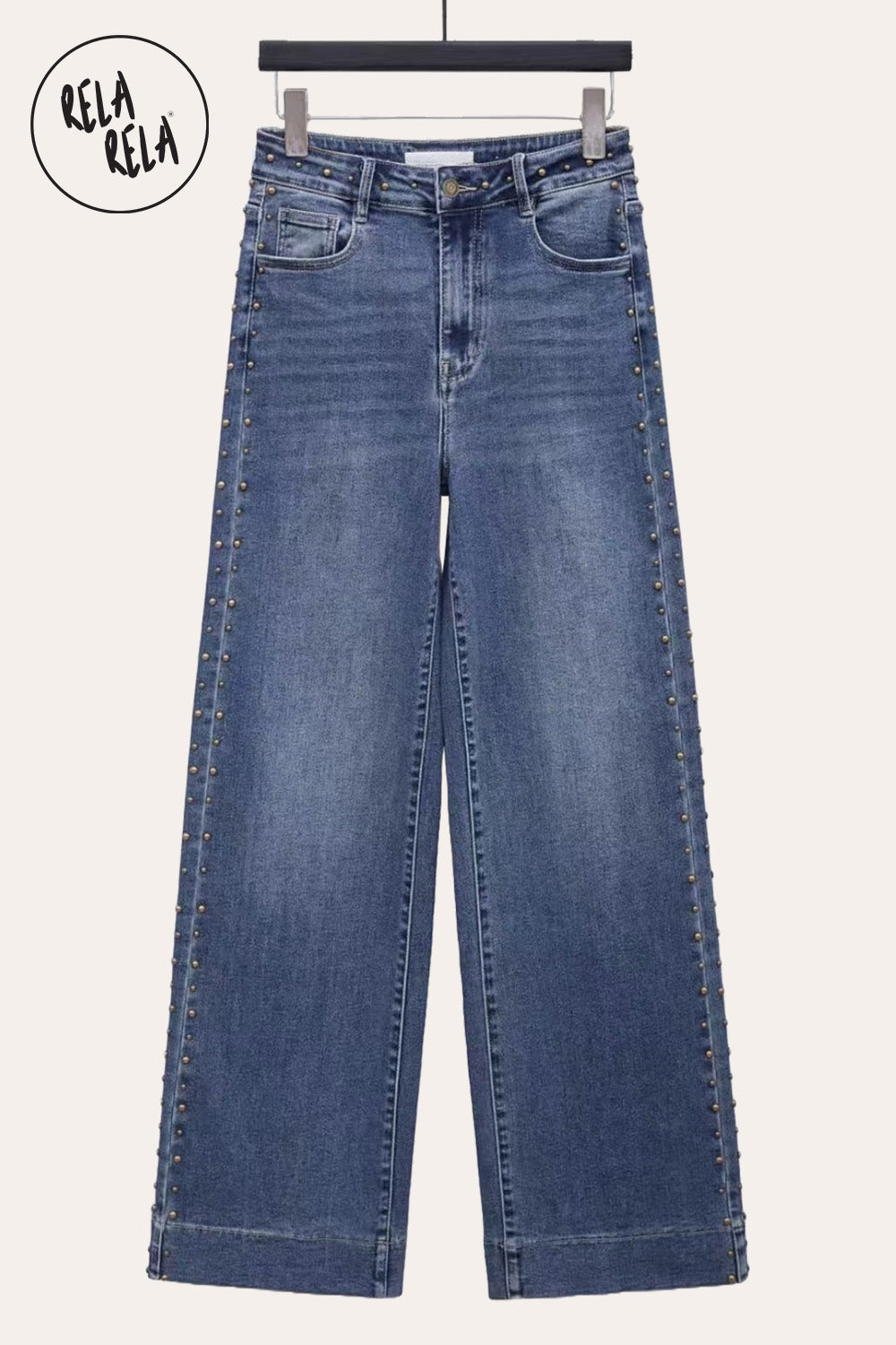 Stretchy Studded Rivet Wide Leg Jeans – Indigo Wash