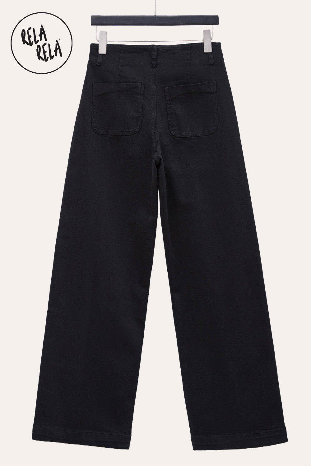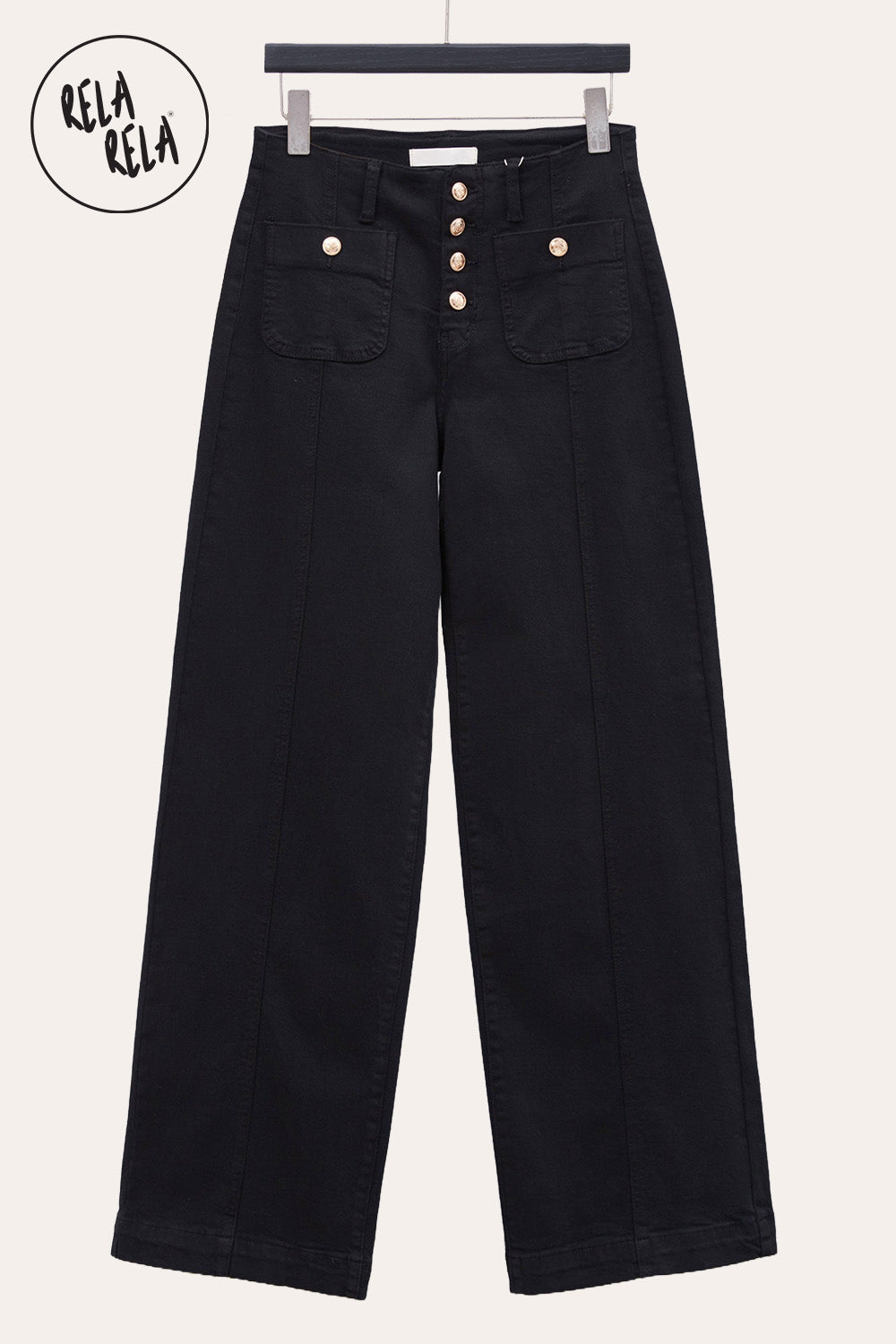 Black Stretchy Wide Leg Seamed Jeans with Button Details
