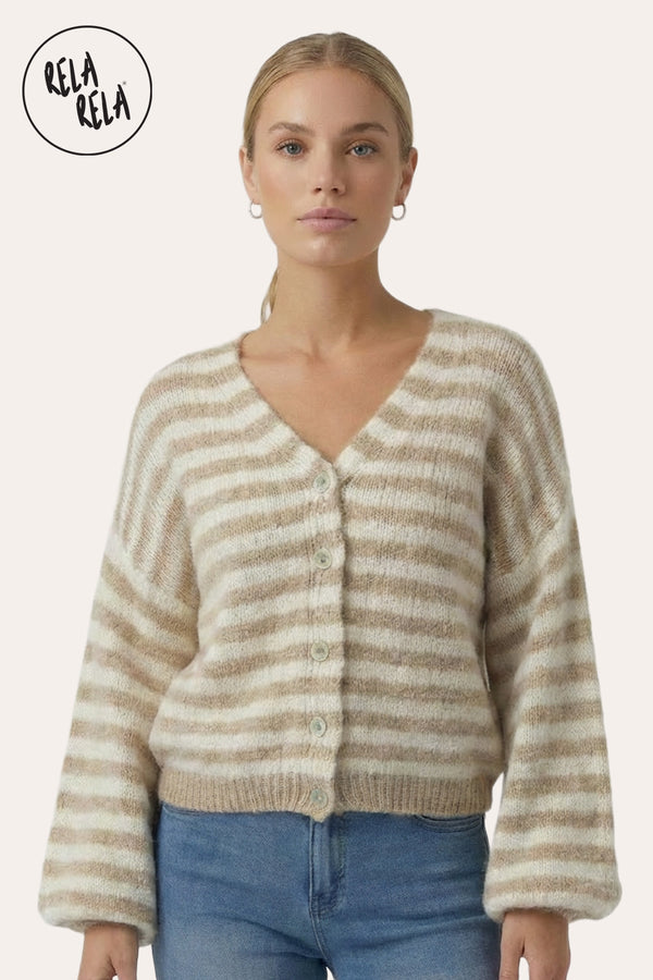 Striped Colour Contrast Lounge Cardigan with Buttons in Beige/Cream – Cozy Neutral Elegance