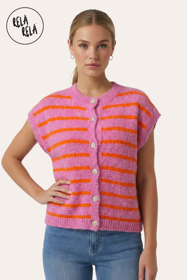 Striped Knitted Sleeveless Jumper Vest with Buttons in Pink/Orange – Playful Energy