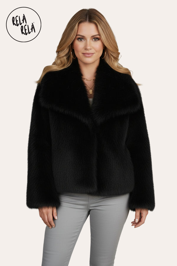 Elevate your seasonal looks with this luxury black faux fur coat, merging oversize design, elegant wide lapels, and cozy warmth into a must-have statement piece for Fall & Winter.